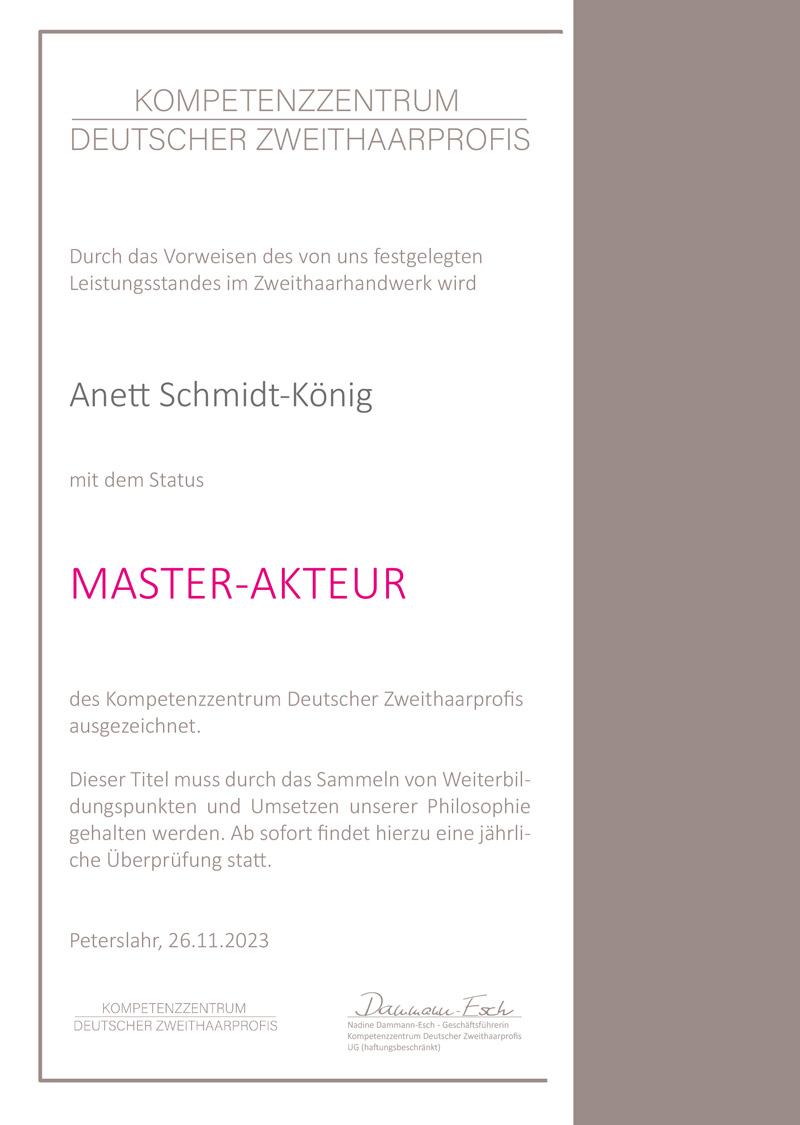 - hat die Ausbildung zur "Geprüfte Fachkraft für Zweithaar" (HWK) vor der Handwerkskammer in Düsseldorf mit Erfolg bestanden